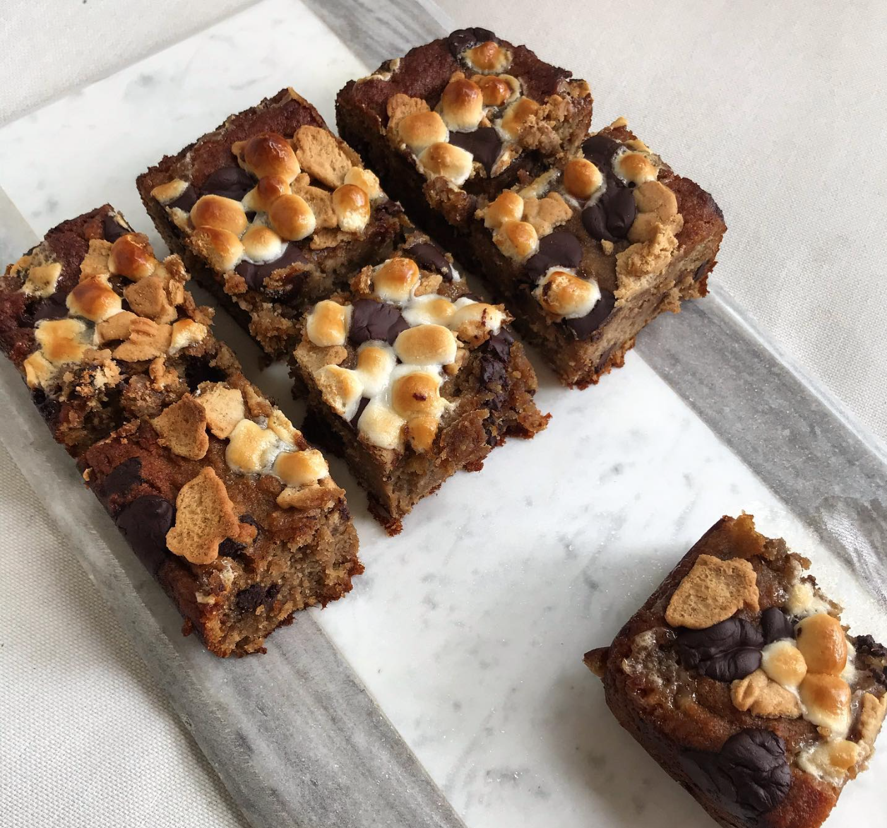 Sprinkle the top with as many marshmallows, graham cracker pieces, and chocolate as your heart desires and then bake in the oven for 50 minutes. Let it cool before cutting.
