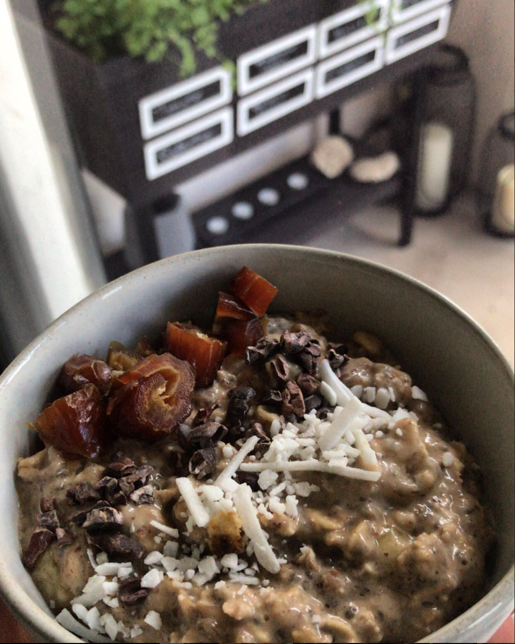 I did chopped dates, cacao nibs and coconut. MAKE SURE to sprinkle a dash of salt on top to add to the salted caramel flavorIn a small sauce pan add your mashed banana, oats, chia, flax and coconut milk with enough water to cover the oats. Cook on medium stirring frequently until very thick and almost all water has evaporated. Take off the heat and stir in your protein powder, maca, and tahini. Top with dates, cacao nibs, coconut and salt.
