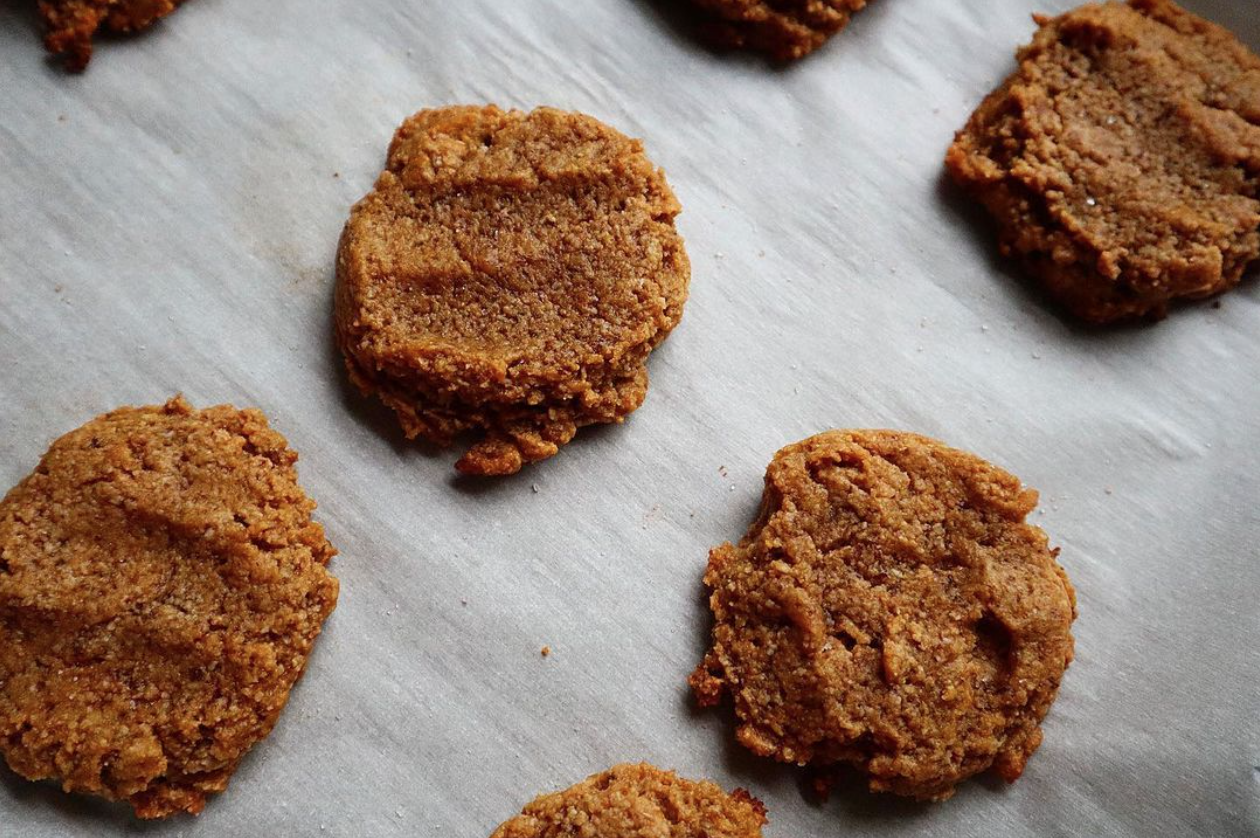 Mix together all the wet ingredients and monk fruit with the peanut butter and flax egg. Then add in the almond flour and baking powder. Mixture should be thick but creamy. Scoop and flatten onto a baking sheet and bake 10-12 min at 350.