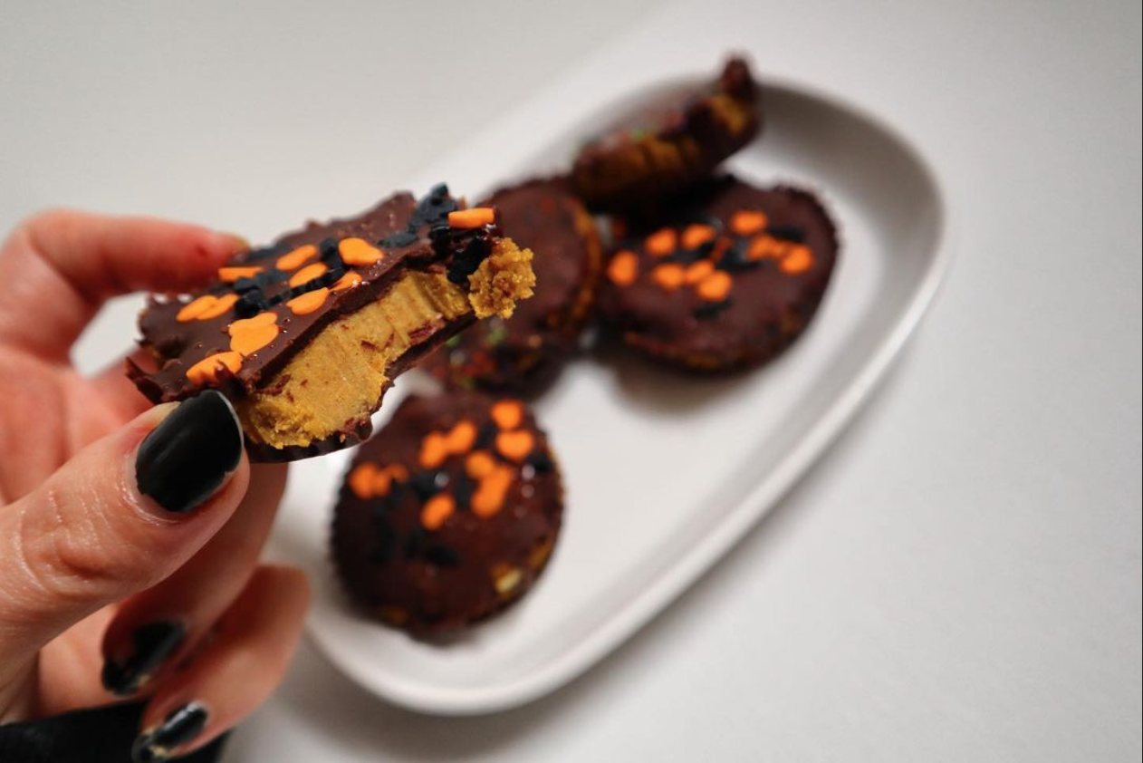 Mix protein, greens powder, pumpkin, and peanut butter together and scoop onto the cooled and hardened chocolate lined baking cups. Even out the layers and top with the remaining chocolate. (You can add sprinkles here if you want). Leave in the fridge to cool until they’re hardened.
