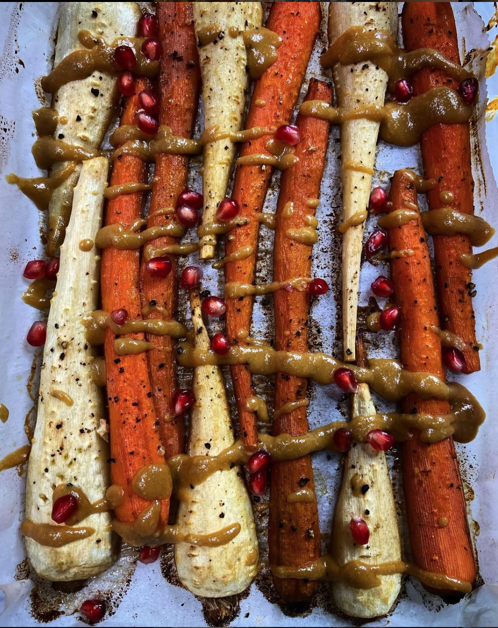 ROASTED CARROTS AND PARSNIPS WITH MAPLE TAHINI DRIZZLE